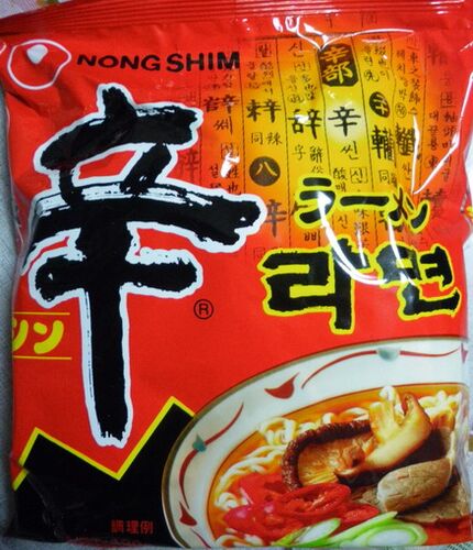韓国のインスタントラーメンです。辛(しん)らーめん。袋ラーメンとカップラーメンがあり、どちらも同じ味です。袋ラーメンはかやくもついてきます。日本の辛さとはやっぱり違いますね。韓国と四川料理も違うし、タイ料理も全然違う。韓国料理の辛さが個人…