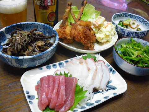 昨日の肴は、マグロとタコ刺し、唐揚げ&ポテサラ、酢のもの、セリ、ゼンマイ炒めでした。