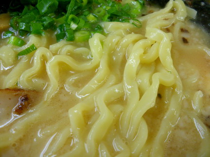 かん水風味の中太の平打ち縮れ麺で、地元アキモト製麺の太麺に似た食感。