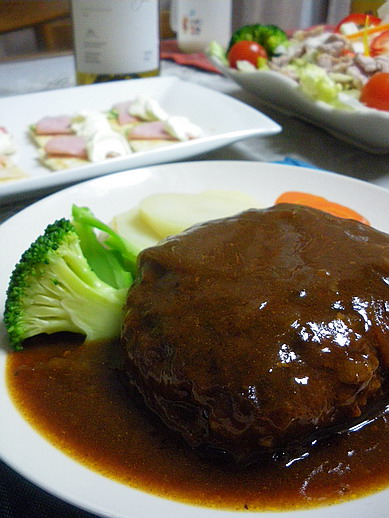 簡単おつまみクラッカーをつまみながら…先日のアルゼンチンの白の残りをまず平らげーの。初日より樽香がかなり落ち着いて、別なワインの様。桃、柑橘系フルーツの味わいが感じられました。この日のメインは副料理長の十八番、「煮込みハンバーグ」♪