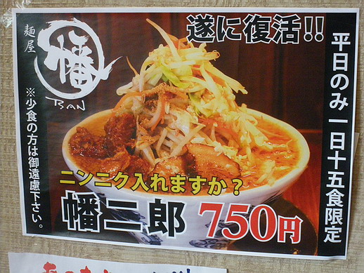 券売機で「まぜめん」と共通のボタンを押して購入。普通でも大盛りなので、「大盛りは無料ですが大盛りにしますか?」と聞かれません。そのかわり、「ニンニク入れますか?」と聞かれます♪「もちろん入れます♪」「野菜マシ脂マシで♪♪♪」ポップの写真はたぶんマシなしのノーマル幡二郎かな?マシだと…