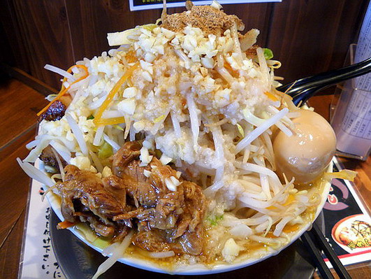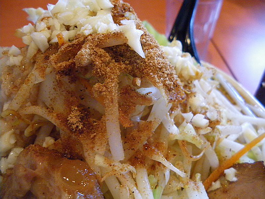 頂上(笑)魚粉が始めからかかってきます。粗みじんのニンニク。もっとたくさんでもよかったかも。私みたいに朝からがっつりにんにく食べる人もいるので、セルフ式でもいいかもしれません^^;