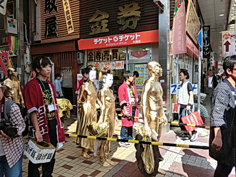 人手が多いのもそのはずこの日は大須のお祭りの日だったようです写真のような人たちもいました女性の上半身は裸ですよ (/ ▽ \;)人ごみが苦手な私は予定していた買い物も早々に切り上げて名古屋港方面へ移動