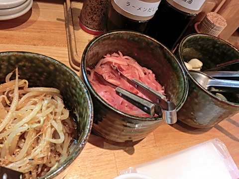 卓上にはゴマラー油もやし、紅ショウガ、粒にんにくが無料トッピングとして常備ラーメンの到着までもやしをつまみながら待ちます