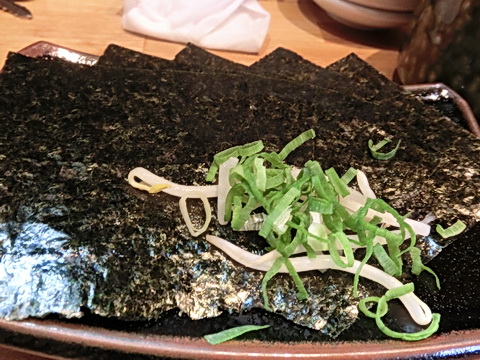 トッピングの海苔は別皿で来ました少量のもやしとネギも一緒にこれは替え玉を見越しての配慮なんでしょうね