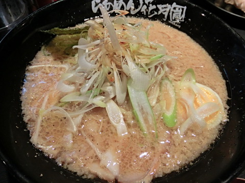 「嵐げんこつらあめん(大盛)+ねぎトッピング」いつも以上に背脂が多い気がするルックスです♪