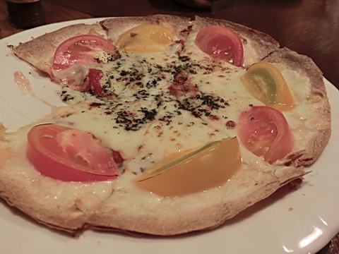 トマトとチーズのピザジューシーなフレッシュトマトに濃厚なチーズのコラボは鉄板ですね生地は薄いクリスピータイプです