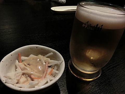 まずはビールでお通しは棒棒鶏風の大根サラダ