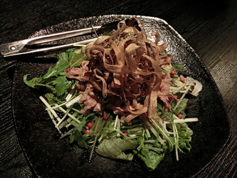 完全に名前を忘れました水菜やレタスと豚冷しゃぶのサラダのようなサラダです上にのっている物体の食感が良いのですが何者だったか思い出せません(;一_一)