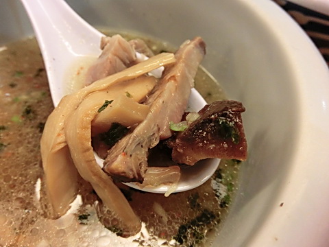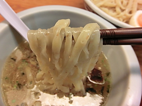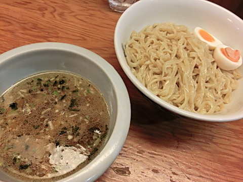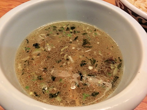 つけ汁は表面に多めの油が浮き濃厚そうな見た目ですが口当たりはさっぱりとしており柑橘系の酸味が爽やかさを演出しておりますさっぱりとしていながらも鶏や魚介系の旨みが濃くアオサ海苔の風味やぴりっとした辛味もあり複雑な風味を楽しむことができました^^スープ割をするとさらに風味が広がり美味しく最後まで完飲しました^^