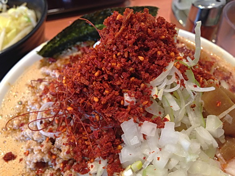 さらに今回はエビ辛追加辛さだけでなく旨みもアップするのでおススメのトッピングです^^私的には十分辛いですけどマイルドな辛さの唐辛子なので辛い物が平気な人には物足りないかもしれないですね現にうちの副料理長は幡辛みそや辛つけ麺にエビ辛をトッピングしても汗もかかずに平然と食べています^^;