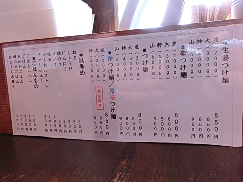 メニューは生姜つけ麺、辛つけ麺、つけ麺に夏季限定の冷つけ麺、冷辛つけ麺にトッピング平日は100食、土日は150食で終了とのことでこの繁盛ぶりだと昼営業だけであっという間に終了してしまうのではないでしょうか高めの値段設定ですが特盛まで値段が同じでトッピングの安さを考えると結構お得だと思います^^