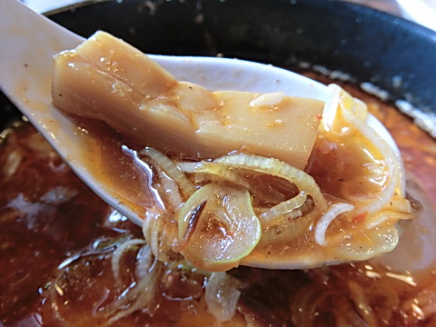 見るからに辛そうな色をしていますが意外とそうでもなく旨さを引き立てるバランスの良い辛さです具材がたっぷり入っており煮干、節系を中心とした魚介出汁にいろいろな香味がくわわっていてなんとも複雑な味わいですあっさりした口当たりで割りスープなしで最後までさっぱりといただけました