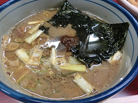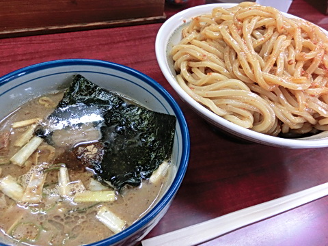 つけ汁は通常のつけ麺と同じもので辛味は入っていません甘みのある濃厚な魚介豚骨系で沈んでしまいましたが海苔の上に魚粉がのっている六厘舎スタイルです具材は小口切りのネギとぶつ切りのネギ沈んでいますがメンマ、拍子木状のチャーシュー、海苔、魚粉味の大きな変化はありませんが開店当初よりも少し濃度が薄くなったでしょうか酸味がなく甘みが強いタイプなのでそれでも重量感があるつけ汁ですね