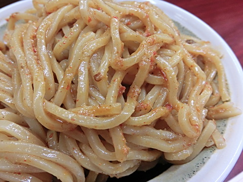 そして、辛味は麺の方につけられています因みに麺量は200gと300gから選択でき、画像は300gです100円増しで大盛400gにすることもできます単なる唐辛子の辛味ではなくニンニクやコチュジャン?など複雑な辛味と旨みをまとった麺です麺だけ食べると刺激的な辛さが口中に広がり無理かも…と思いましたがつけ汁につけて食べると丁度良い辛さになりました^^